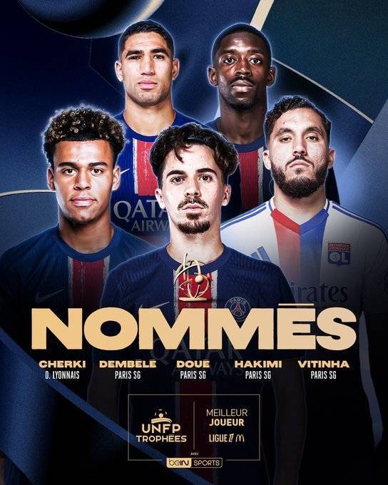 直播吧5月1日讯 UNFP(法国职业球员工会)公布法甲赛季最佳球员候选名单,五位候选人分别是切尔基、登贝莱、杜埃、阿什拉夫、维蒂尼亚。